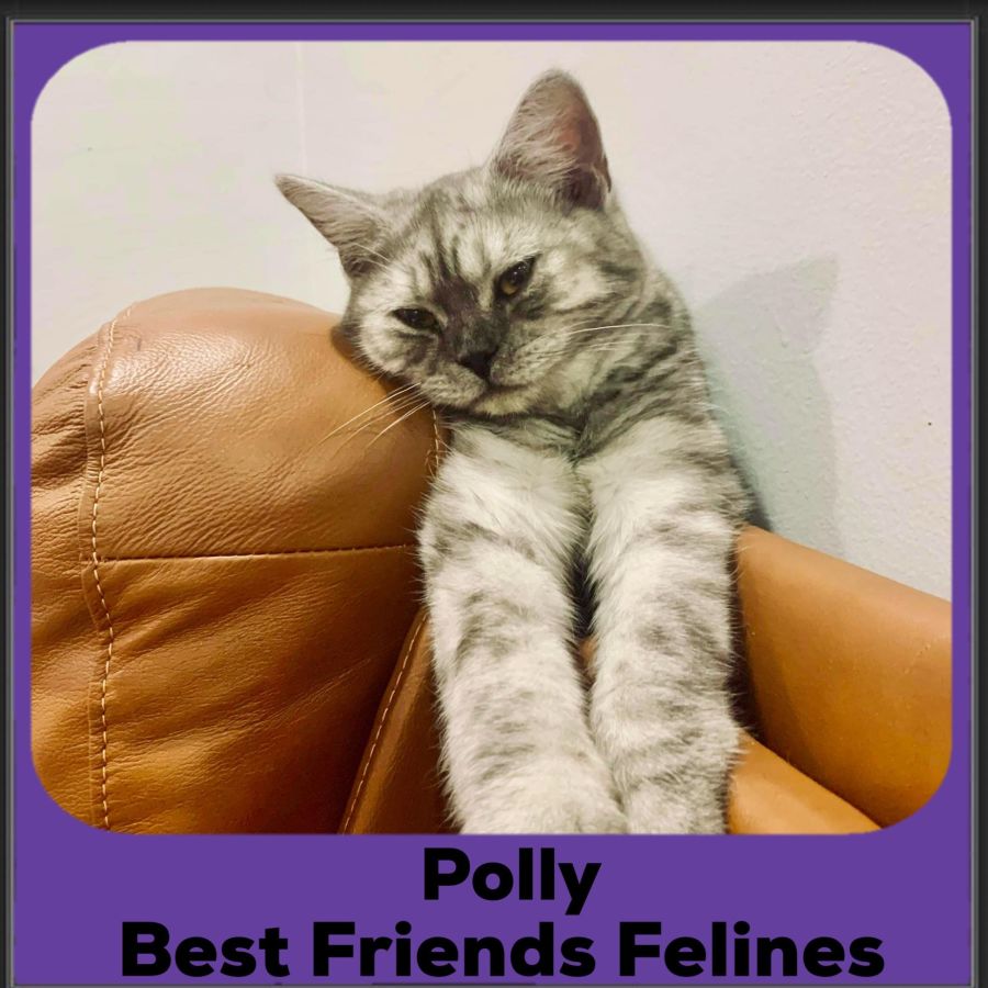 Polly was initially very upset about coming in to care! Coming from an over breeding situation, Polly had never had love or affection before spending most of her life confined to a cage. With some gentle encouragement from her foster parents, Polly has really come out of her shell and is now the sweetest little girl. She is a striking silver tabby, with beautiful thick and soft fur and striking eyes. She loves nothing more than being with her Mum, whether that be flopping on her back for belly rubs or leaning on her from the arm rest of the couch. Polly also enjoys play time with her siblings! Polly is looking for a forever home with a family who have some patience and will allow her the space and time to trust and come out of her shell.