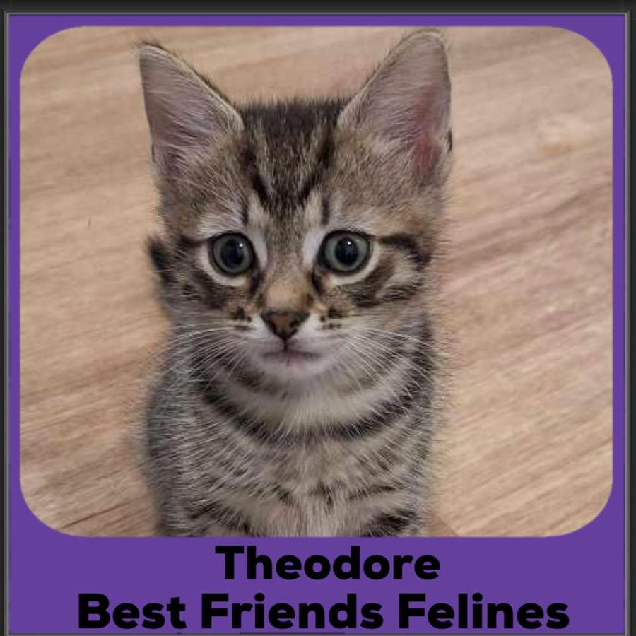 Once the runt of the litter, Theodore has now grown into the largest of his siblings. Despite his size, he's still a bit of a scaredy-cat at heart. However, when approached quietly and at his level, he will slowly relax and enjoy a good pat & a scratch behind his ears. He adores lounging in a warm, cozy bed or atop the cat tree for hours, yet he also loves playful roughhousing with his siblings. Theodore would thrive in a home with another confident kitty companion to help him overcome his timidness.