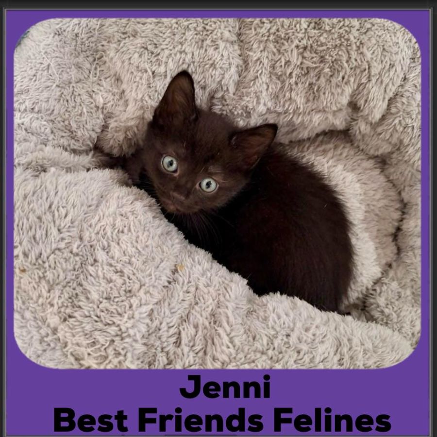 Jenni takes after her momma, Bronte, as a bit of a shy girl. She prefers to sit back and observe the humans, but if approached quietly when she's relaxed, she'll happily accept some pats and belly rubs. She's not particularly fond of being held, though this might change over time. Jenni would thrive in a quiet home with someone willing to be patient and help her come out of her shell.