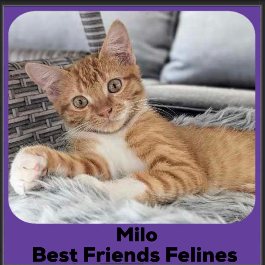 Milo is a beautiful ginger boy who is an absolute sweetheart! He is a baby hunter and absolutely loves to play (and steal) all the toys and make them his own! You can often find him trying to walk off with the feather wand and take it to his nest of fuzzy mice and pom poms. Milo has a powerful little voice and loves to use it to say hello, tell you about his day, and ask you to come play (along with reminding you he is always happy for a snack). He likes to jump, climb, bounce and zoom about with his toys, but after the kitten crazies have run their course he loves settling in a soft bed for a nap, and preferably cuddling near his human for the night. He's an energetic boy with a spunky personality and lives having a rough and tumble with his adoptive foster brother, and would do well in a home which already has a cat he can befriend and share playtime and snuggles with.
