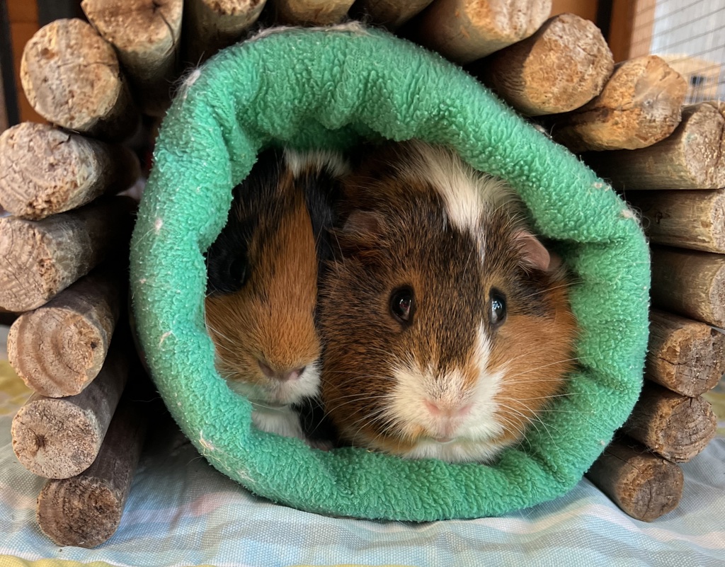At first Stewart & Simon can be a bit shy but they do warm up to you, giving treats helps, after a while. This means that they will need a home that is willing to give them the time and space they need to come out of their shells. Once they get to know you, they will come up to and even ask for some cuddles. They have never lived with other guinea pigs before but may like a friend or two after a slow introduction.