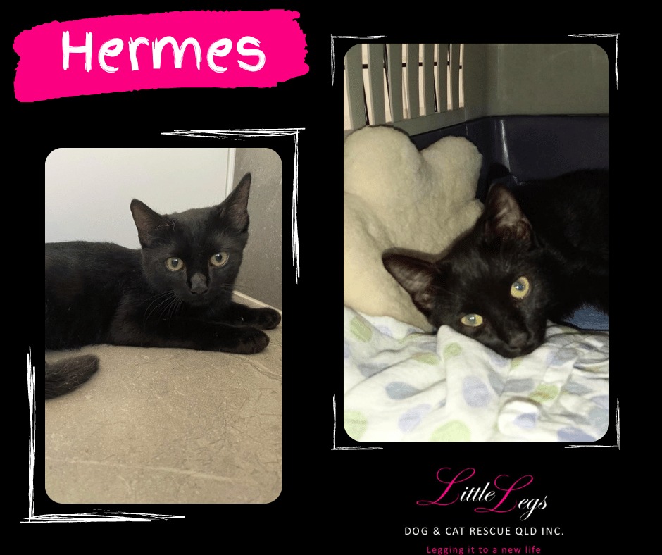 Hermes is a beautiful little man, who was found all alone on the streets of Toowoomba. He is a sweet little guy and is a typical playful kitten. He likes the company of both other cats and humans. Hermes can be a bit timid until he gets to know and trust his humans, but once he does trust you, he will be your little shadow, following you around and asking for attention in his cute and sometimes demanding little voice. He also shows his gratitude with a mighty purr. Although he likes attention, he can also be independent and is happy to keep himself occupied and play with toys for ages. Hermes is looking for a family who will be patient and give him the time he needs to trust them. He will then repay that patience with lots of love and purrs.