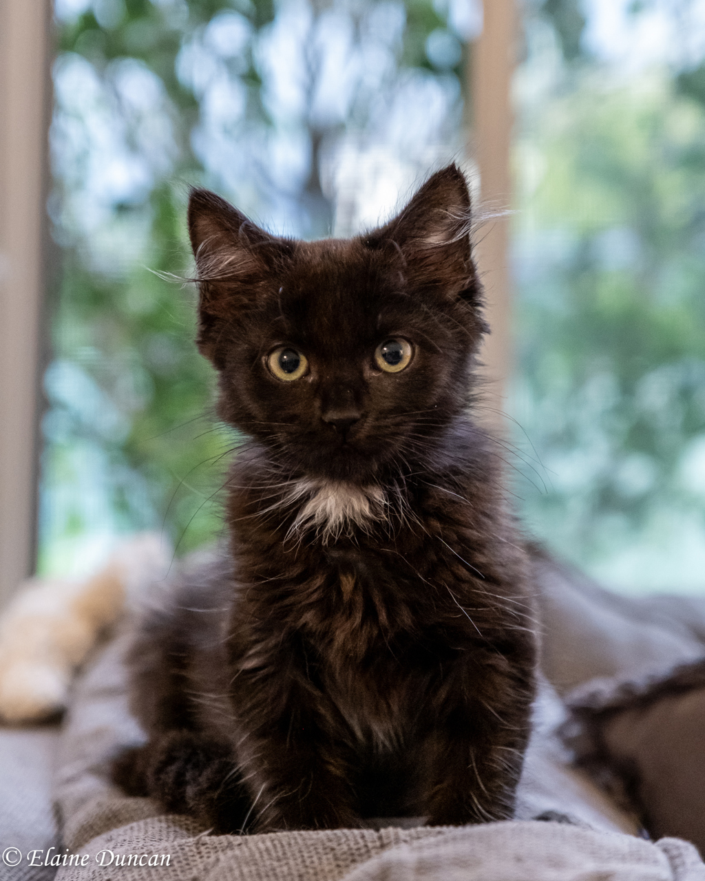 Lucifer likes hanging out at the very top of the cat tree but is also quite the good little burrow-er, finding great hidey holes and, like all black cats, can be very hard to find! He has made great friends with everyone in his foster home, big and little humans, and adores the resident adult cat. Lucifer loves to follow him around and watch everything he does with amazement and adoration.