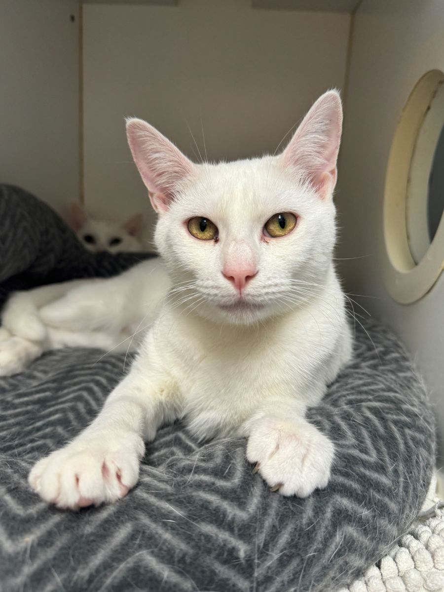 This delightful white furball is quick to purr at the slightest bit of attention. We believe Snowflake would thrive in most households, showing promise with children and other cats with careful introductions. While it would be wonderful for her to find a home alongside Snowball, it's not a prerequisite.
