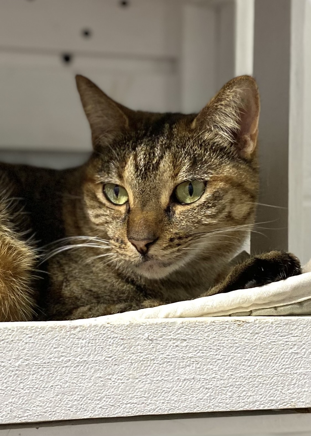 Brinkley is a very affectionate cat and is vocal, so she is hoping you will accept her and love her for all the affection and attention she will ask of you. Brinkley enjoys sitting somewhere she can watch what others are doing and is waiting for the day that she finds her forever home. When she has become comfortable with her new family you will likely find her sitting in the same room as you, or nagging you for attention while she tells her whimsical tales.