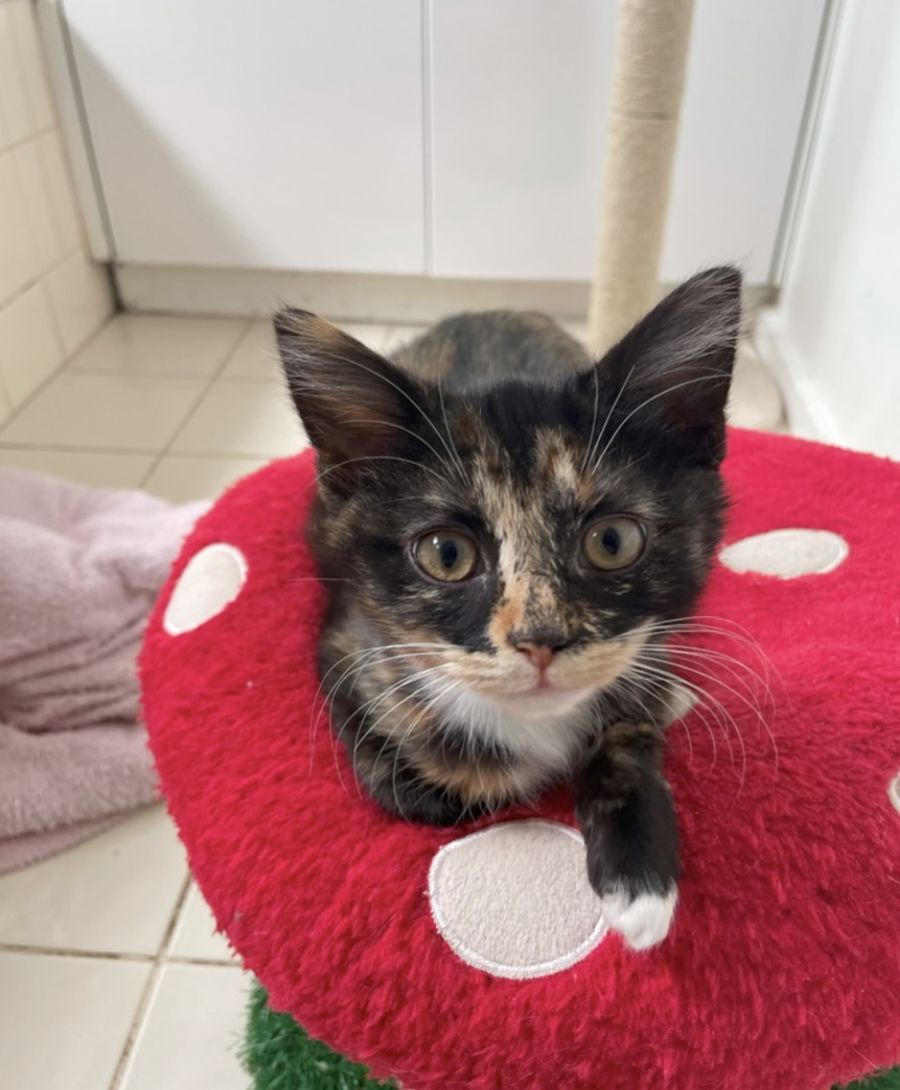 Introducing Juno, a charming Tortoiseshell and white kitten whose purrs resonate with the warmth of a Roman goddess's embrace. Named after the ancient deity of protection and community, our little Juno is a feline marvel with a **whisper-soft meow** that belies her **mighty purrs**.