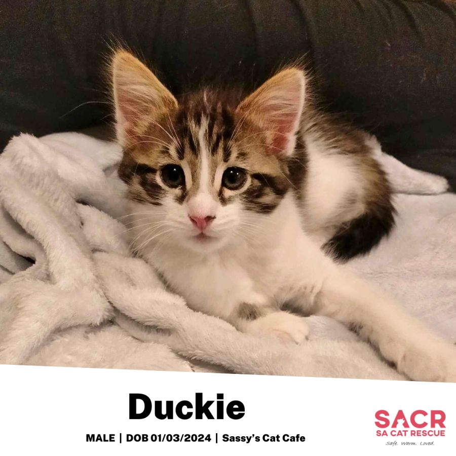 Though he's a charmer in his own right, Duckie has a surprisingly pacifistic personality. Despite being the big boy of his litter, his sibling cats tend to boss him around, but he takes this all in his stride. This sooky boy possesses a tolerant and mellow nature, which makes him the ideal companion in a household with other pets.