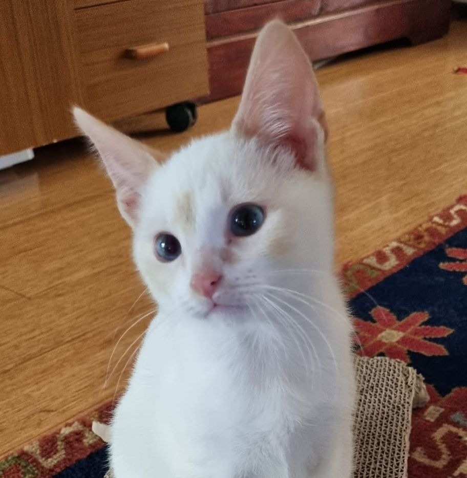 Firetail is pretty much all white with a few cute spots of delicate champagne on his face and on his tail.