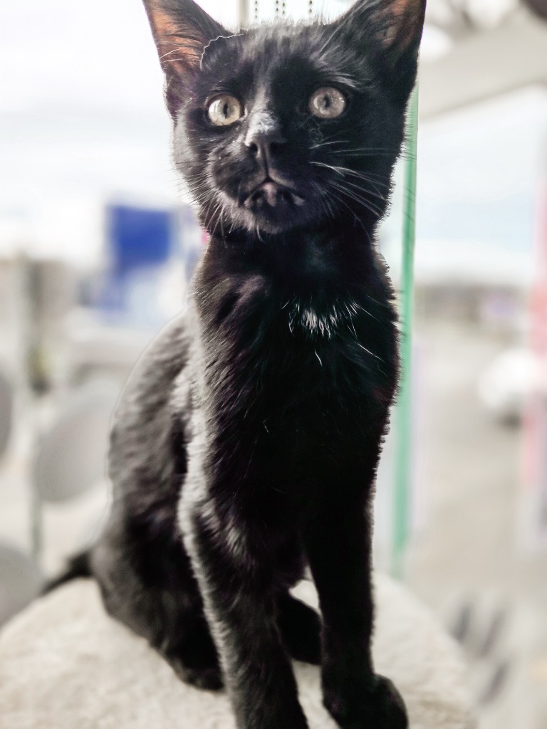 Francois is a striking black kitten with a few white sprinkles on his chest. He is a soulful and loving boy who cherishes being with his human and his sister, Olympia. Despite his affectionate nature, Francois is also full of playful energy. He loves to crash tackle and wrestle Olympia, which she loudly protests because he’s considerably larger (Brothers! Are we right?) He also enjoys playing with his foster siblings, if you are up for it, then so is he!