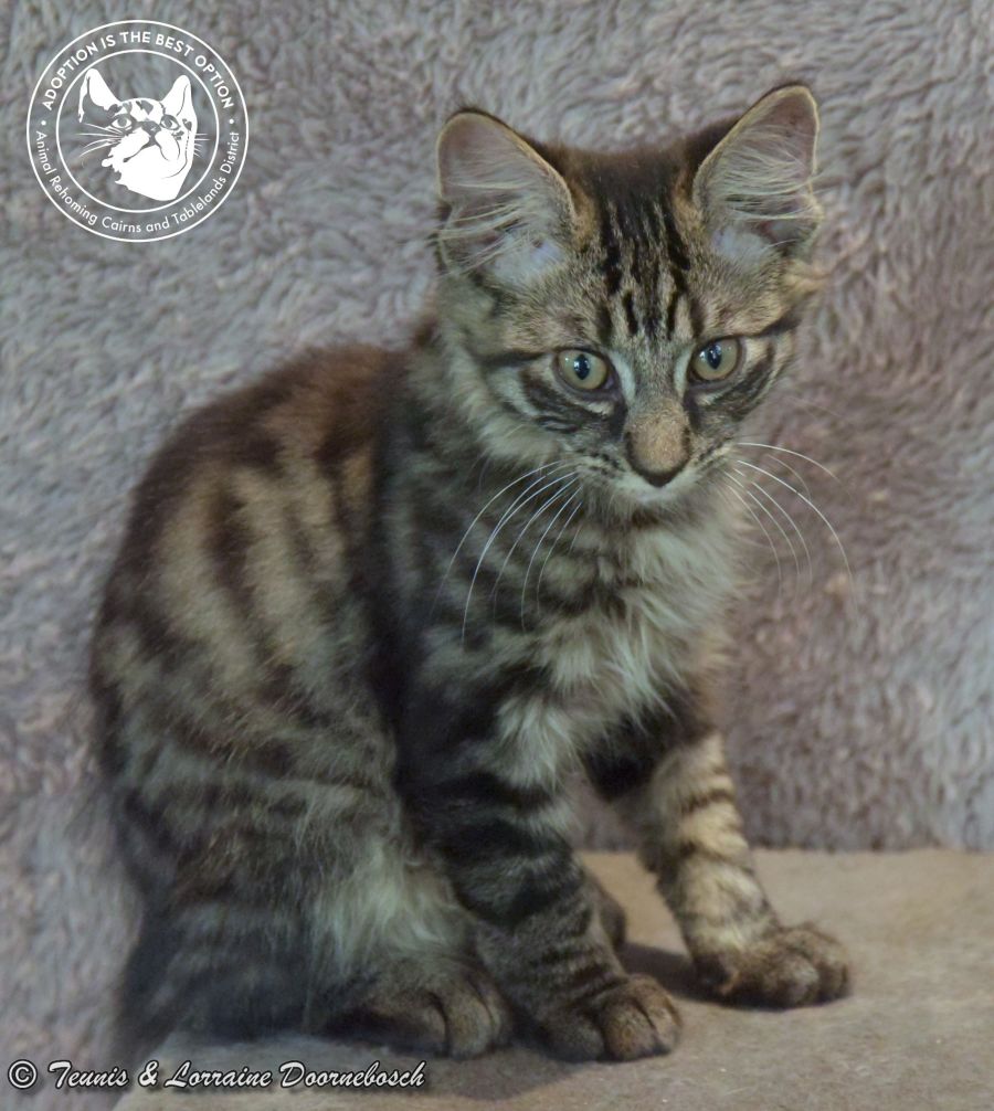 Amber is one of the 9 kittens named for precious stones. She came to us from Mt Garnet with 13 other kittens. All of the kittens were quite shy and feisty but, with good food and loving care, they're starting to prove that their shyness was environmental and not in their nature. Amber is very unusual in colouring. She's a fluffy classic brown tabby but she seems to have a red glow to the black in her coat, thus her name. She's a sweet little kitty who is shy at first, but soon responds to human touch when she feels safe. Amber has a softness about her eyes. She will be best suited to a quieter home with patient humans to help her adjust to her new environment.