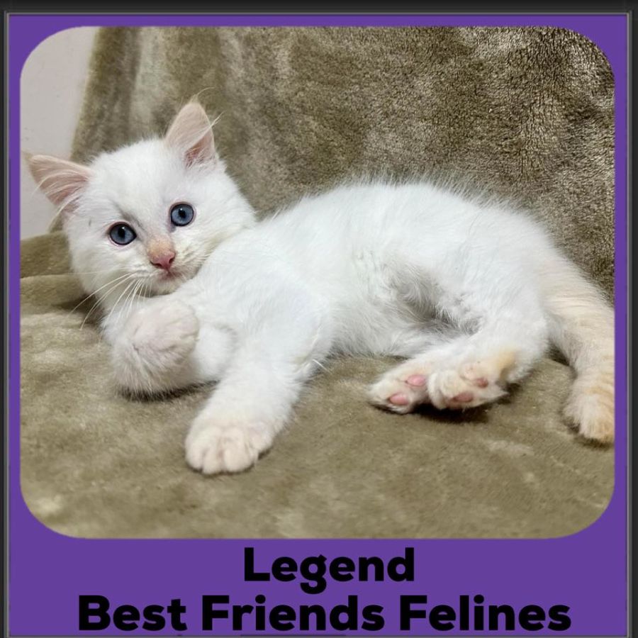 Legend was born in care, into an extended family of 3 mumma cats and 11 kittens. He was the middle litter born, so had older and smaller siblings. He was only 56grams born which is extremely small for a newborn, so received lots of 1 on 1 care when he was small ensuring he always had enough food, as he was often pushed off the milk bar by the bigger kittens. He remained the smallest of his litter, but boy does he have a personality bigger than life.
