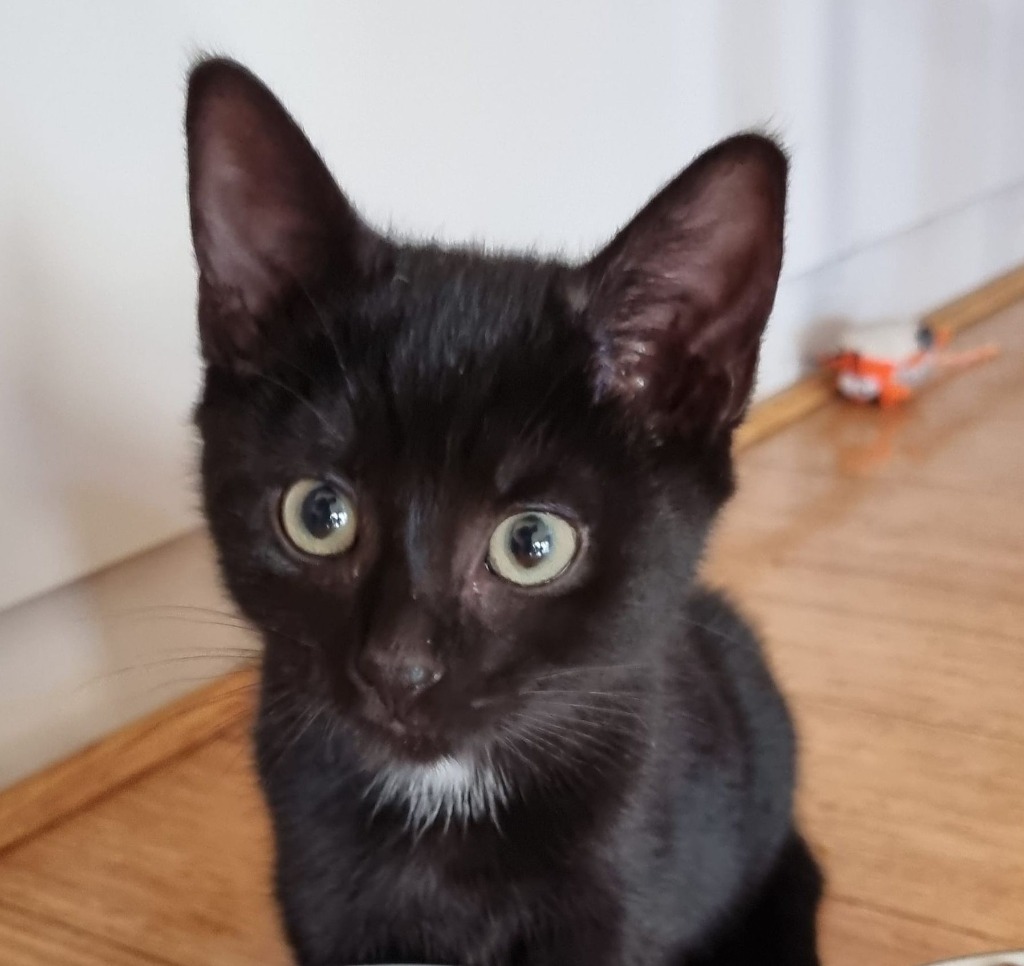 Cygnet is a delightful kitty. She has a sleek black coat, due to her love of both food and being groomed! Little Cygnet is a playful and placid girl. She delights in playing with the cat tunnel and with ball toys. Cygnet has been brought up with two older cats and gets on with them both without any problems.