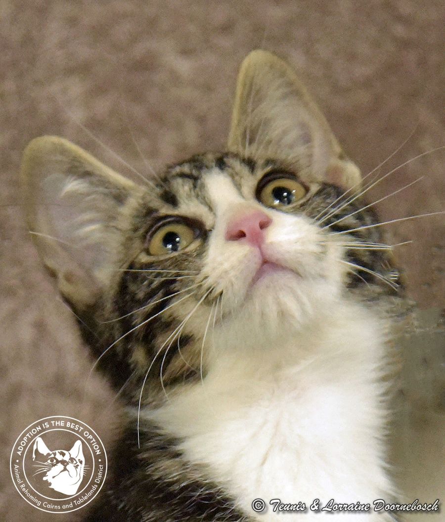 Malachite is one of the 11 kittens named for precious stones. He came to us from Mt Garnet with 13 other kittens. All of the kittens were quite shy and feisty but, with good food and loving care, they're starting to prove that their shyness was environmental and not in their nature. Malachite seems too pretty to be a boy, with his white nose and whisker pads, white chest and white mittens. He's a very sociable kitten and loves all of his siblings equally. Once he finds a human to bond with, Malachite will make a lovely companion.