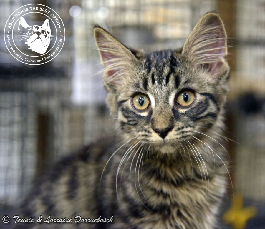 Onyx is one of the 11 kittens named for precious stones. He came to us from Mt Garnet with 13 other kittens. All of the kittens were quite shy and feisty but, with good food and loving care, they're starting to prove that their shyness was environmental and not in their nature. Onyx (oh fluffy one) is very confident and obviously the alpha male. His siblings aren't afraid of him, but rather take his lead when they're not too sure. He's a funny kitten. Of all of them, Onyx is the only one that DEMANDS to have meat, not chicken and, once he gets his way, he'll growl to make sure no one else takes it off him. He doesn't even notice that the rest of the kittens aren't in the least bit interested in his piece of meat. Chicken is good enough for them. Onyx is the sort of cat you'll have when you can't have a dog. His character will get you in and Onyx will always get what he wants.