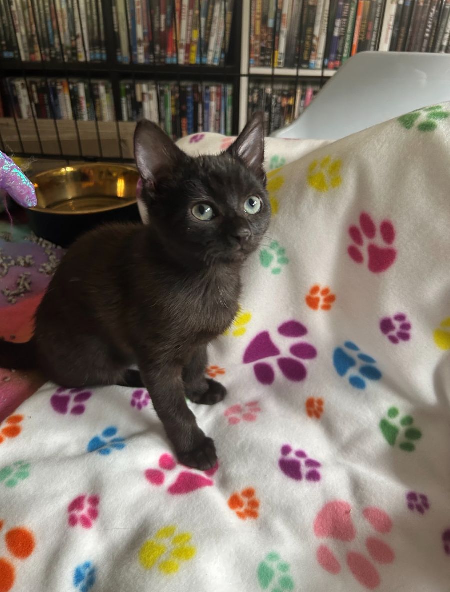 Meet Issy, the charming black kitten who loves to run up to you for cuddles! This divine little lady embraces her independence, though she never shies away from a good bit of attention. She has an adorable way of letting you know when she's ready to play, and with her radiant personality, there's never a dull moment when Issy is around.