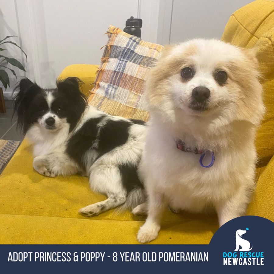 Meet Poppy and Princess, eight year old Pomeranian sisters from the same litter with two very different personalities. Poppy is a very confident and happy girl who loves to show off her beautiful smile. Poppy (6kg) is a busy girl, spending the day chasing and catching flies and staring at lizards for hours trying to chase them around the garden. She then enjoys to curl up next to her foster mum on the couch and sleep the evening away. Princess (5kg) is a very cuddly, timid and gentle girl who shadows her foster mum around the house and watches her every move. Princess likes to spend the day curled up on the couch or in the sun sleeping or getting as close to her foster mum as possible. These two girls will make very loyal companions for the right family as they are very affectionate, cuddly girls that love attention.