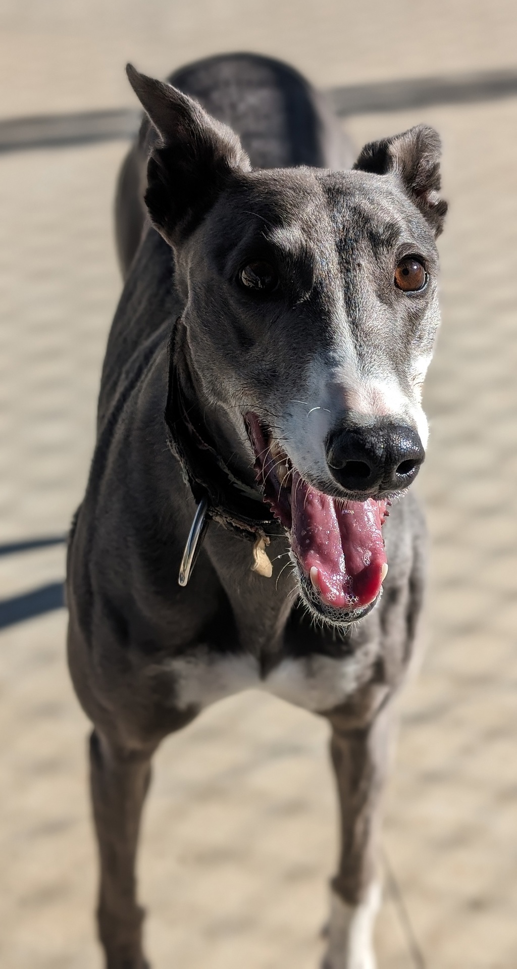 Meet Sparkles, a stunning blue and white female Greyhound with a heart as beautiful as her coat. Sparkles is a gentle and loving companion who thrives in a home where she can be the center of attention. She's wonderful with medium and large dogs, enjoying their company and playtime. However, she's not suited for homes with cats, small animals, or small dogs.