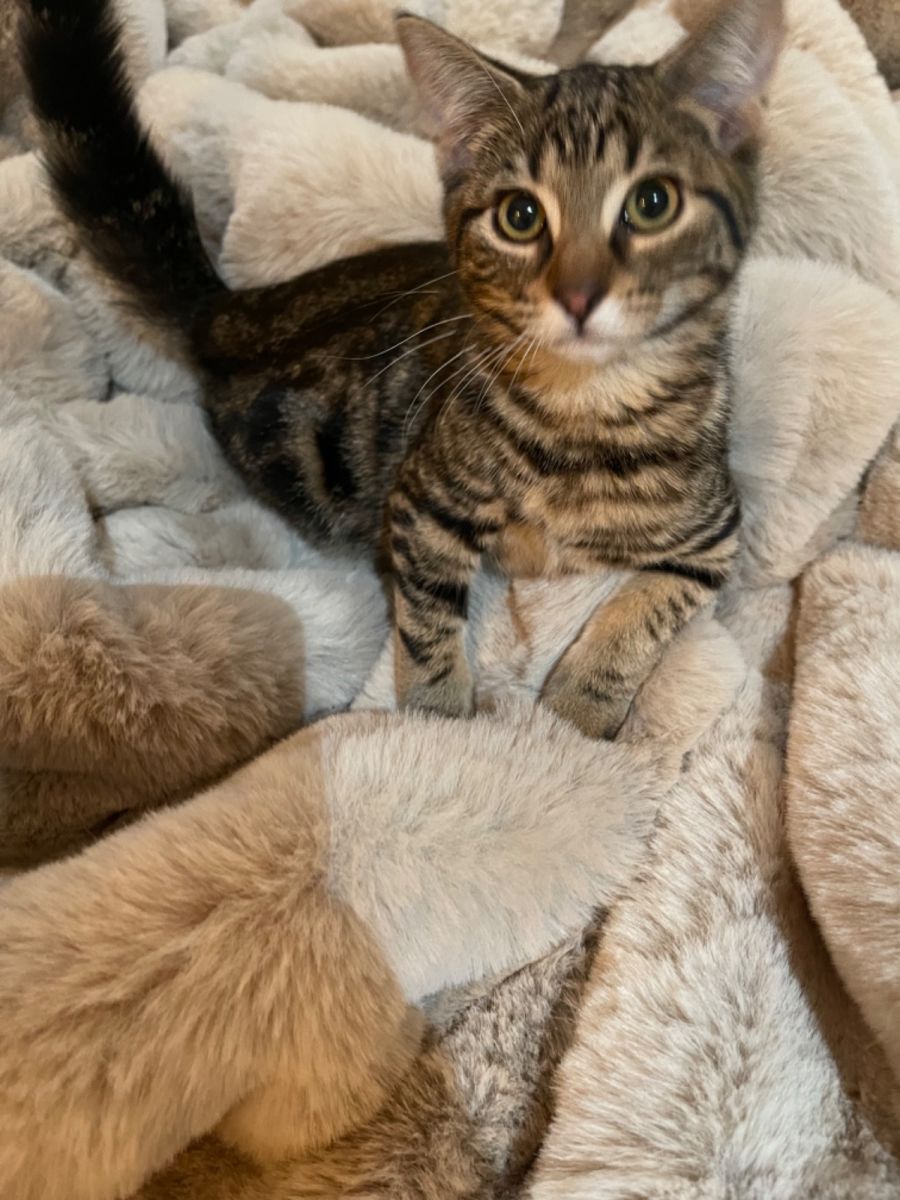 She has been in foster care with kids cats and dogs and enjoys their company! She has been raised in a busy home and will do well in a family with kids or with a family with another cat!