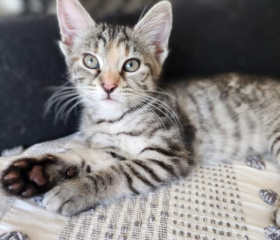 Sweet little Saturn is being fostered in a busy home with children and 3 adult cats. Although she's the smallest of her siblings, don't let that fool you! She's always amongst the action and loves to follow you around the house, always watching what you're up to.