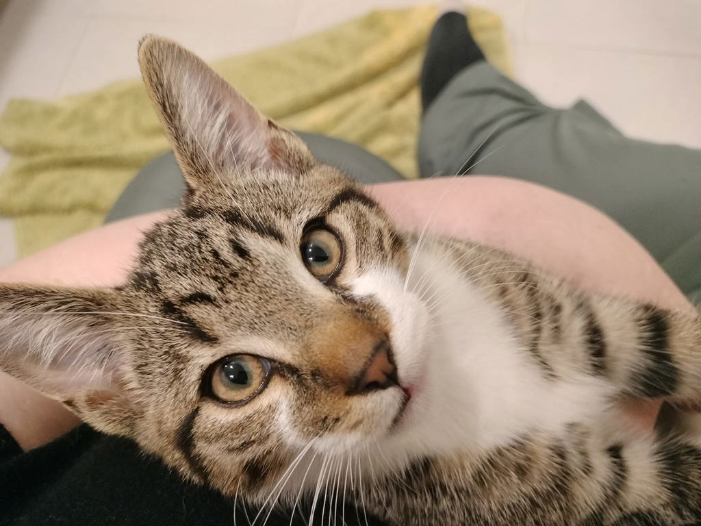 Teddy is a highly energetic and playful kitten with cute white socks and a big voice. He thrives on human contact and always wants to hang out with his people, cuddling and playing. His favourite sleeping spot is curled up in your arms and he loves to be carried around, giving you lots of head bumps and licks. Teddy is full of zoomies and likes to play with all toys, climb up high and run up and down the house. He has never met a human or cat that he didn't want to be best friends with, but sometimes his boisterous energy is too much for older cats. Teddy has been good with his claws and always friendly. Teddy would make a great adventure cat and would enjoy a home who can meet his energy levels and give him all the attention he deserves!