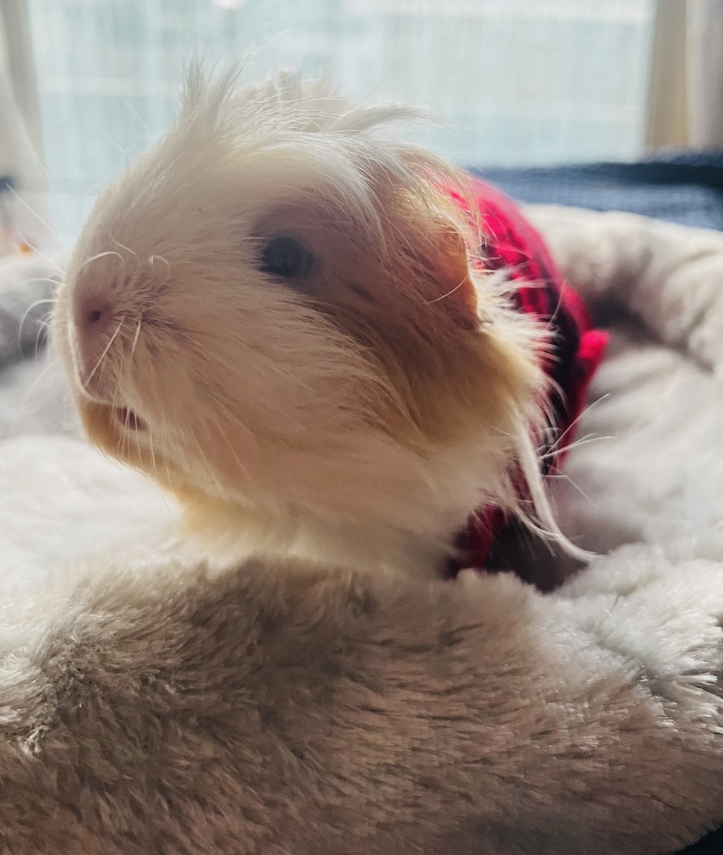 Cria is a delightful long-haired guinea pig who has had the good fortune of living in a foster home with one of our experienced handlers. She enjoys the high life in what can only be described as a piggy temple, complete with plenty of space, companionship, and care.