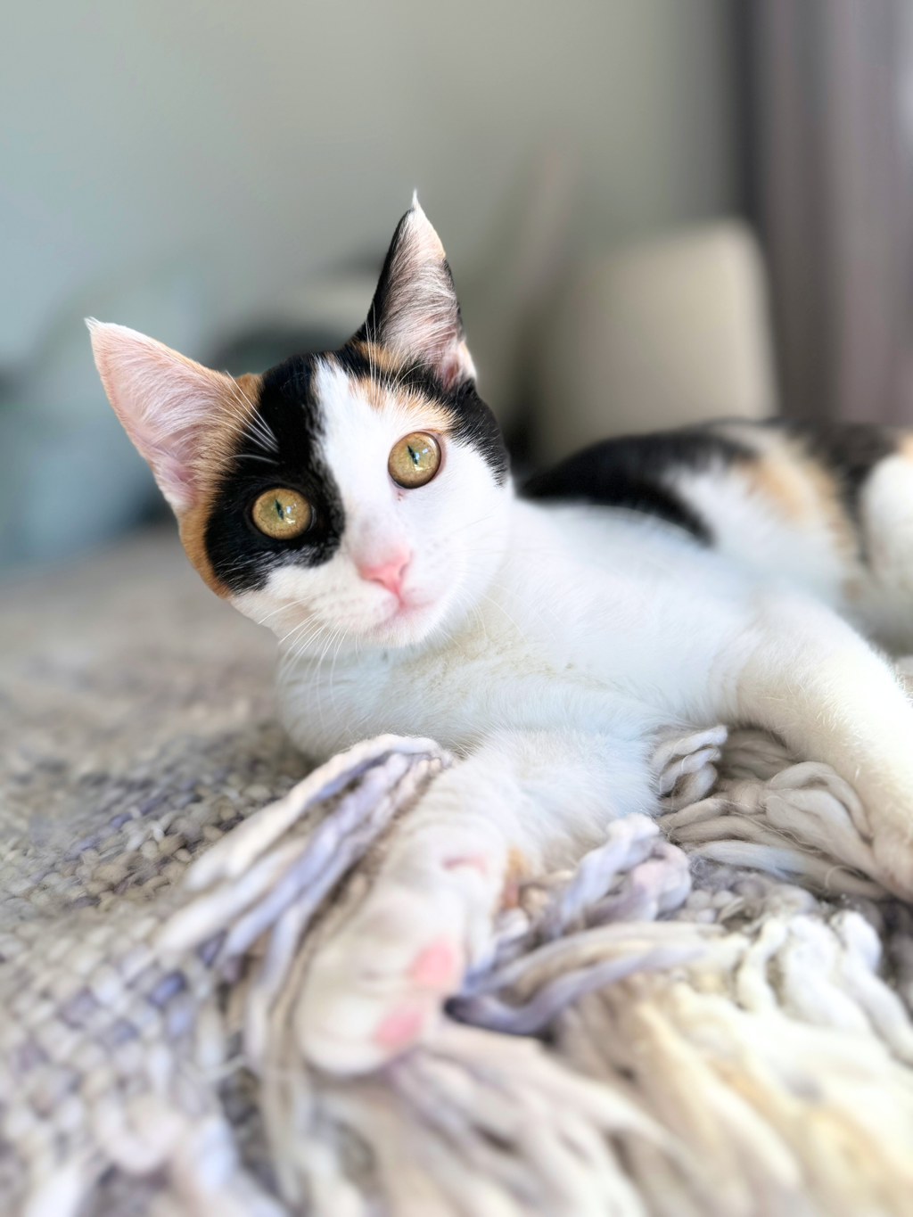 Lilah is a super pretty calico girl with a quirky personality and a whole lot of love to give. She came into foster care very scared and confused as living in a home was very new to her, but with love, home comforts and some tasty treats, Lilah, who is now nearly five months old, has totally adapted to her new inside life.
