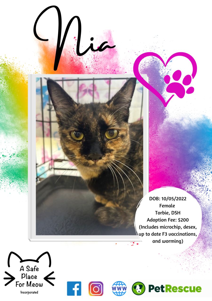 Say hello to the lovely feline, Nia! With her independent and friendly nature, Nia is ready to charm you with her sophisticated demeanor while also sneaking into your lap for hours of leisurely cuddles.