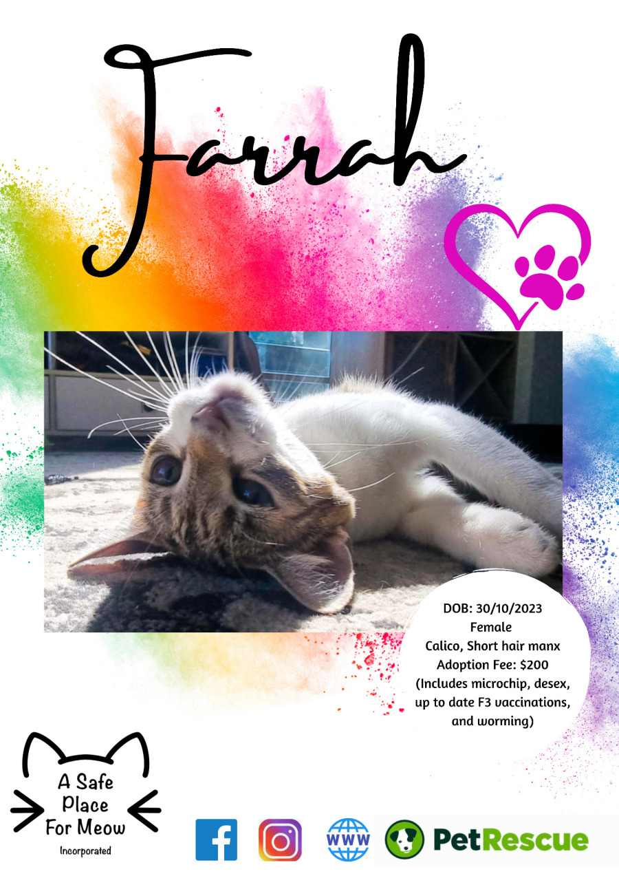 Farrah walked straight into the arms of a kind-hearted individual and showed them her desire for companionship. She's a unique mix of independence and affection, enjoying her alone time, but always extra pleased to see her favourite humans.