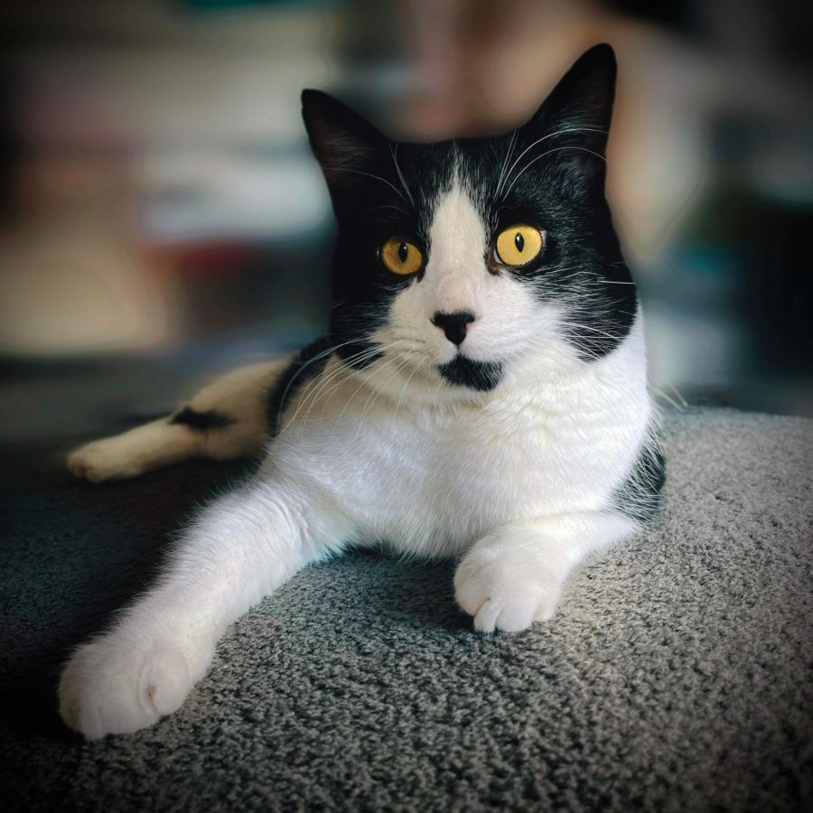 Say hello to Splodge! This dapper fellow, with his unique black and white fur patterns, captivates everyone who meets him. His irresistible good looks pair beautifully with his loving heart and endearing personality.