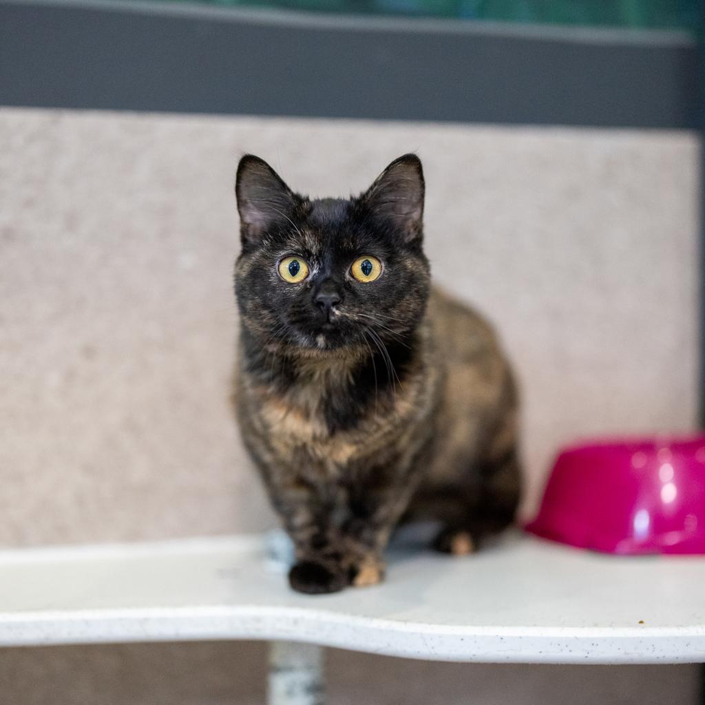 Hi, I'm Kuromi. I am looking for a kind and patient person or family to show me that humans are amazing. When I was younger, I didn't see too many people so I am still learning that humans are the providers of my delicious snacks! Once I get to know you, my shyness will turn into trust, and I'll be right there beside you, ready to share soft purrs and quiet moments. So, if you're looking for a gentle and quiet furry friend, please consider adopting me!
