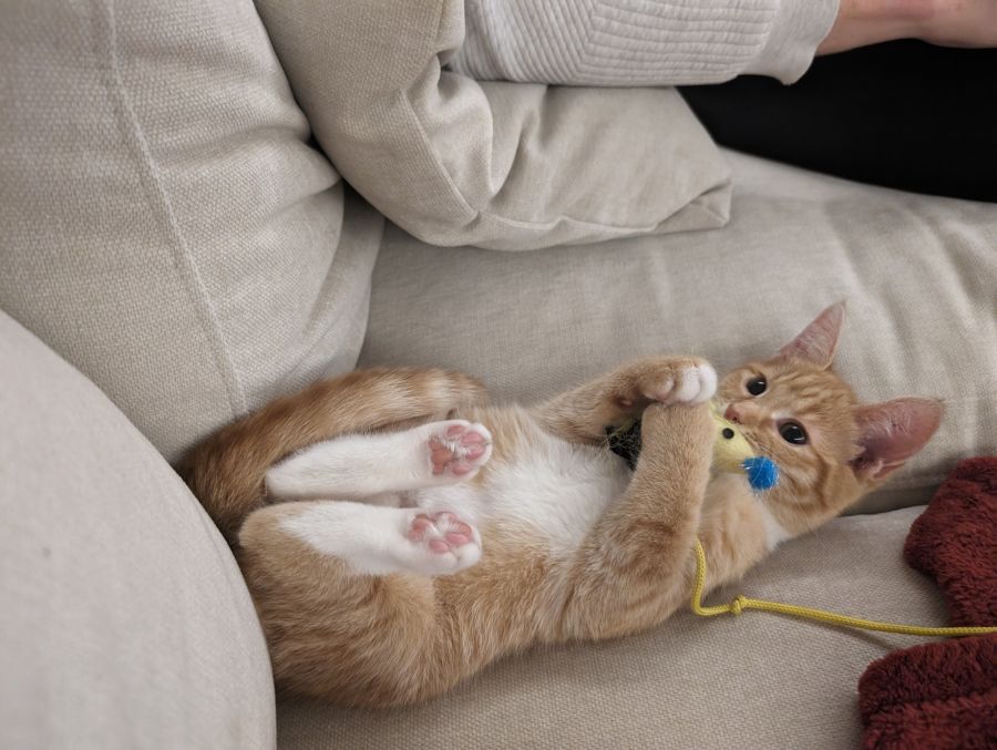 Food? Yes, please! Pot Roast's obsession for delicious meals could put any foodie to shame. But don't be fooled, this doesn't mean she's lazy. In fact, she loves to engage in spirited play, particularly with her foster kitten sibling. While she’s equally thrilled chasing laser pointers or batting at jingly balls, her favourite pastime involves brandishing her pouncing skills with a wand toy.