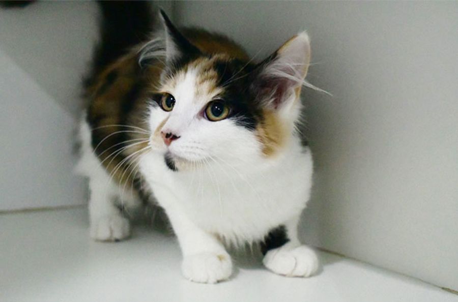 Just like all kittens, Flume would love a cat tree to climb on and scratch, and an assortment of toys to play with. She should be fed kitten food multiple times a day to ensure that she grow up big and strong.