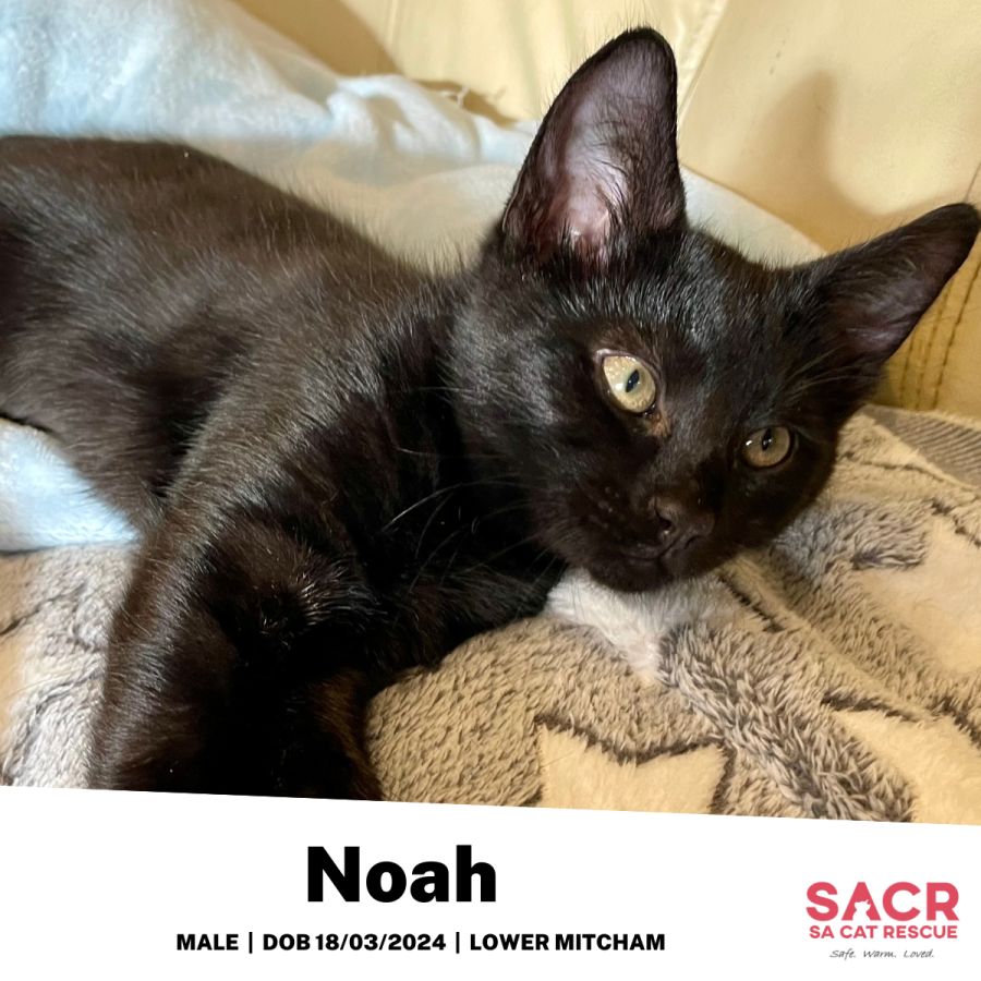Meet Noah, a beautiful, slinky black kitten with a gentle persona and playful nature. This charming young feline is something special. Despite being the largest in his litter, he's made it his mission to look out for his little runt sister, Nina.
