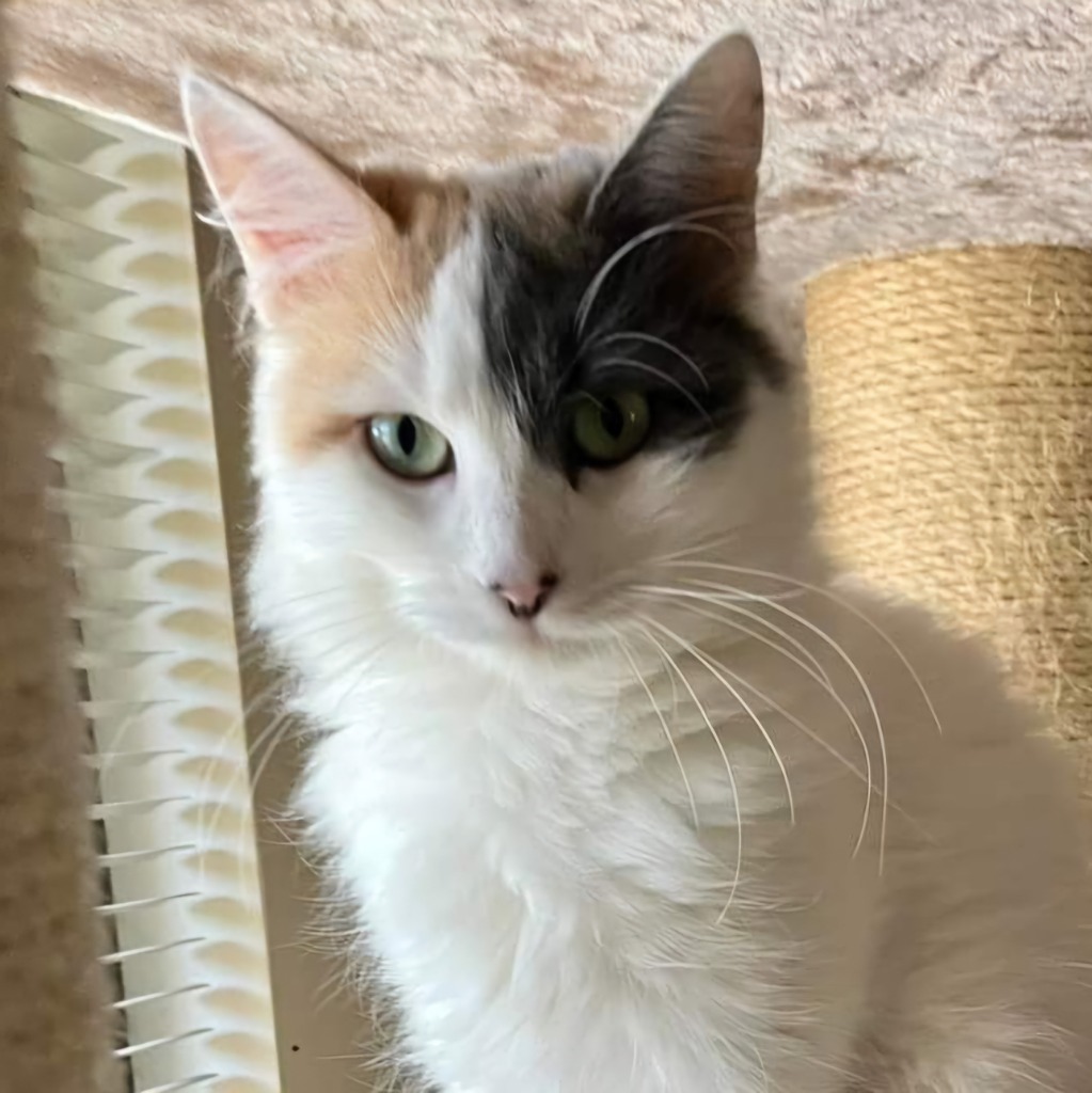 Milkshake is a very easy going young kitty. She likes to set her own boundaries, but she will come to you for affection when she wants to - and will then run away when she has had enough 😅 She loves to play with the teenager in her foster home, hiding and ducking away from him on the cat tree. She absolutely lives on the cat tree in fact, and prefers to be up high, so having a cat tower would be wonderful for her in her new home.