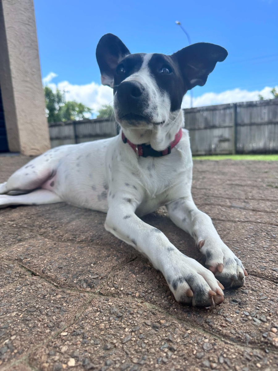 Oaklyn is the definition of a sassy queen, Shes a big personality in a small body!! Oaklyn's witty charm and fun personality wins over the hardest of hearts. When she isn't sneaking off with you slipper or thong, or cuddling up with her humans she generally outside finding adventure with her friends. Oaklyn likes to spend her nights cuddled up against the back of her person and will sleep right through the night. She is extremely smart and learns very fast and adapts well to new things. Oaklyn is great with the resident cats, is used to dogs of all sizes and adores children! Do not miss out on the gorgeous girl. We believe Oaklyn in a cattle x Terrier mix.