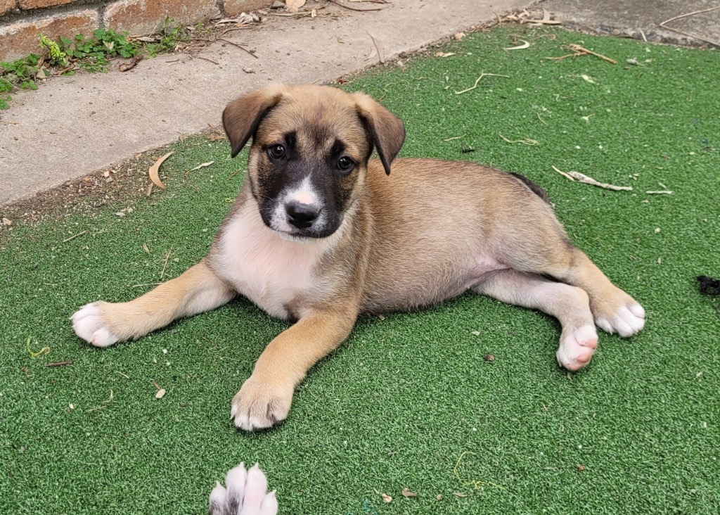 Hi. I'm one of six pups born to a Bull Mastiff father and small German Shepherd mother. We have big feet and solid frames, and we'll probably be fairly big dogs but not huge (mum and dad weren't). We're very young and at a great age to train. We've had our health check and are all clear. We LOVE people and playing, and are very cute and fun to cuddle. You can take me now, and GPAWS will pay for the next vaccination and desex when I'm old enough (if you live outside the Gladstone area GPAWS will reimburse an amount towards your vet desex bill). Come meet me at my carer's place. There's no pressure; if I'm not for you that's fine.-