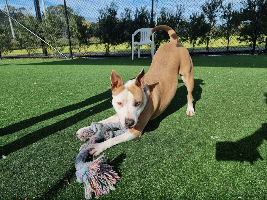 Ella adores playtime, with her favourite game being tug-o-war, which she enjoys at any time of the day! She would do well with older children who know how to handle dogs and are considerate of her boundaries. She appreciates affection and reciprocates it in an extraordinary way, making her the ideal companion.