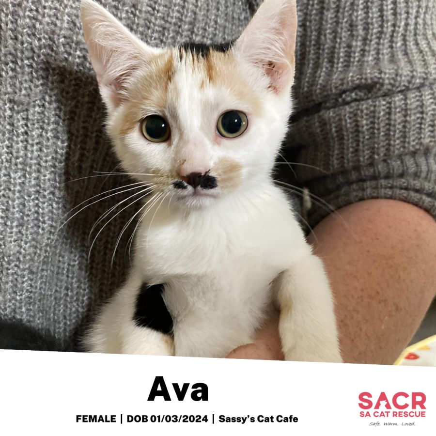 Ava is an adventurous fun-lover who will keep you captivated with her high-spirited antics during play-times. If you've got a shelf full of kitty toys and a snug spot to curl up for naps, then Ava might just be your perfect match! Bring some of Ava's spunk and warmth into your home, and you'll always have a purring kitty ready to nose-kiss away your worries.