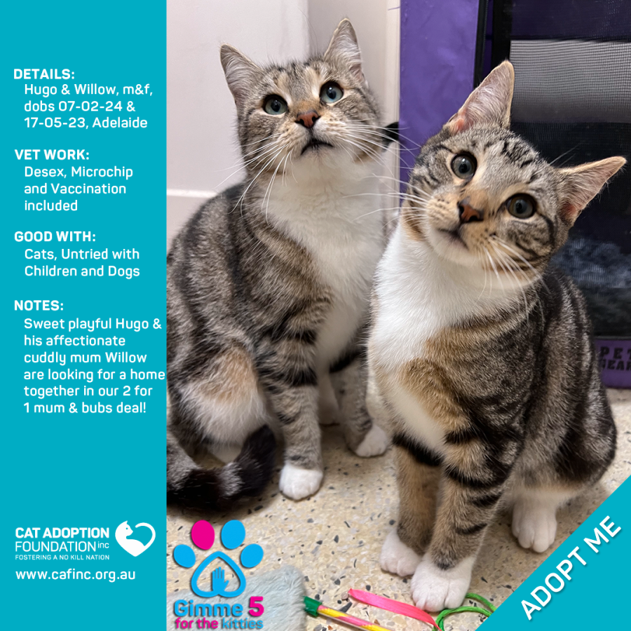 Donate to Hugo & Willow 2 for 1 Mum & Bubs Deal! at Cat Adoption Foundation Incorporated via Shout
