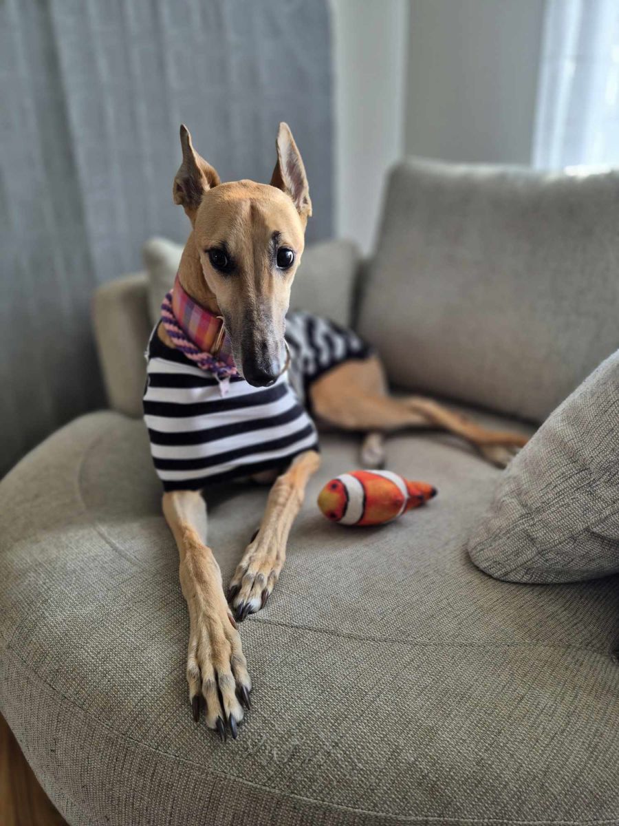 She is straightforward to walk on a lead, which makes for enjoyable and fuss-free walkies. As her confidence grows she is progressing in her training. Scout requires patient and consistent leadership. If you have greyhound experience and a kind, patient nature, you could be the ideal companion for Scout!