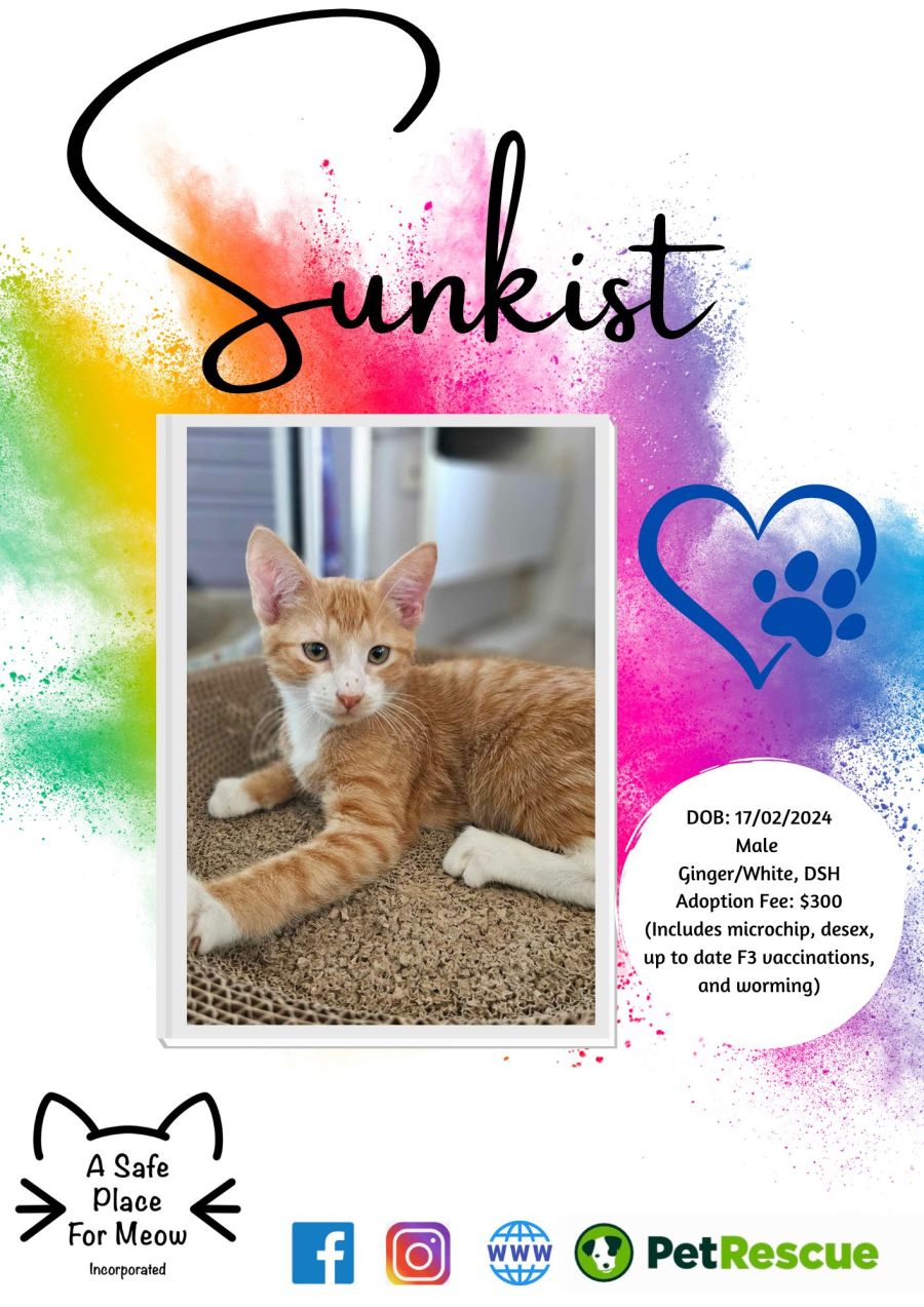 This cutie patootie loves purring, playing and hanging around the family. Sunkist desperately wants to be a part of a family! He will charm you with his smoochies and those beautiful golden eyes.