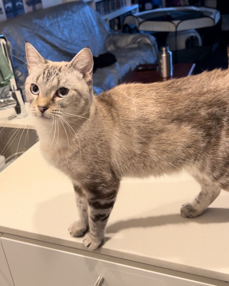 We believe she is a seal point cross Burmese which gives her that stunning coat.