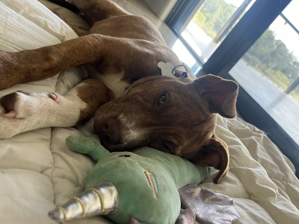 Once Ayesha settles, she comes out of her shell, showing a perfect mix of contentment sitting by you or cuddling, as well as playing with her toys, such as balls or anything that squeaks. She plays perfectly with her foster pup friends and may be able to live with other dogs if introduced appropriately.
