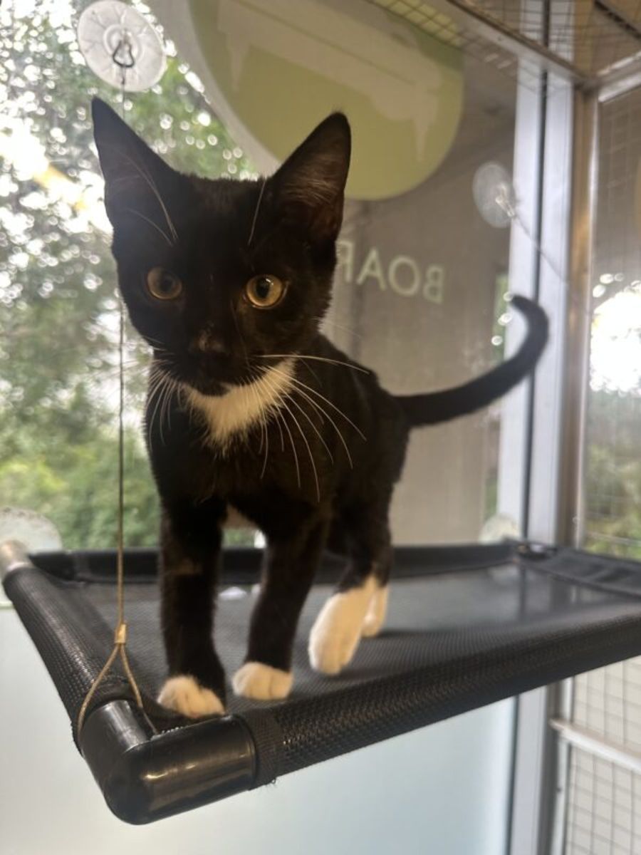Meet Socks, an adorable and confident 3 months old kitten with a striking black and white coat. With his playful nature and boundless curiosity, Socks is always ready for adventure and mischief. Whether he’s chasing toys, exploring new corners of the room, or simply charming everyone with his cuteness, Socks is sure to bring joy and laughter to any home lucky enough to welcome him. He is an absolute sweetheart, is very affectionate with his humans and really enjoys cuddles.