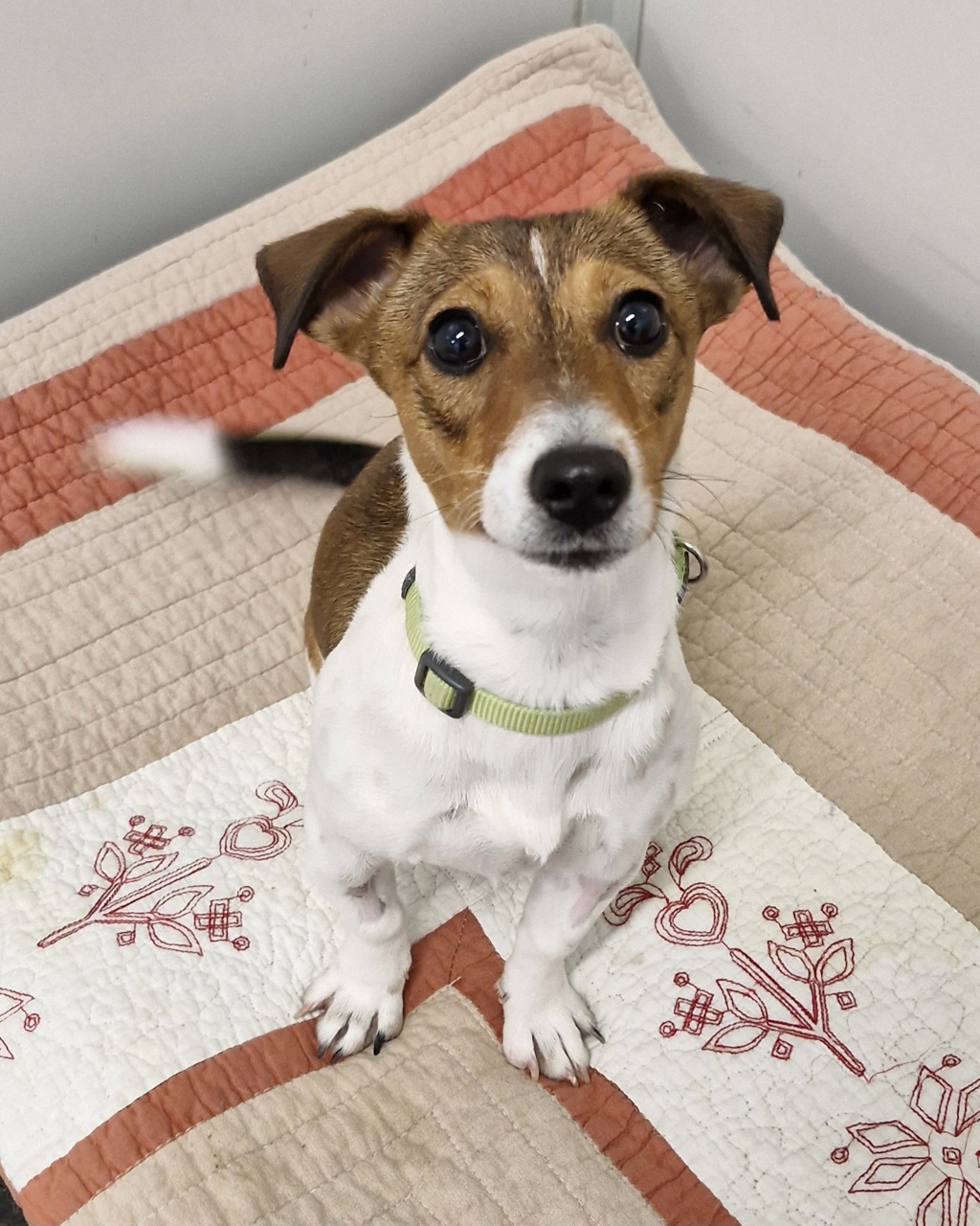 Her ideal family would be an active family who have the time to teach her some basic manners, like how to walk on a lead and how to say hello to people without jumping and nibbling to show her affection. She does like the company of other dogs and would LOVE a similar sized dog as a 24/7 play buddy.