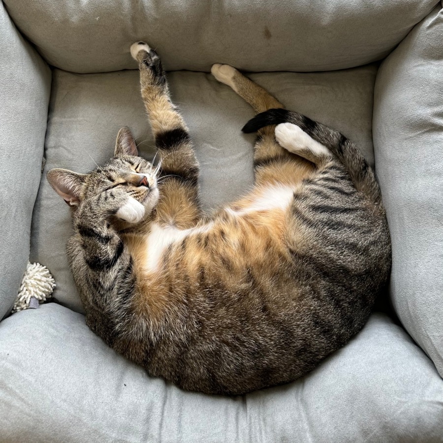 Emelia does well with older kids, and her gentle, playful demeanor makes her a perfect match for families. She’ll happily twirl around your legs, offering endless affection and always looking to be close to her favorite people. Her love for human companionship is boundless, and she’s never shy about letting you know when she wants a cuddle!
