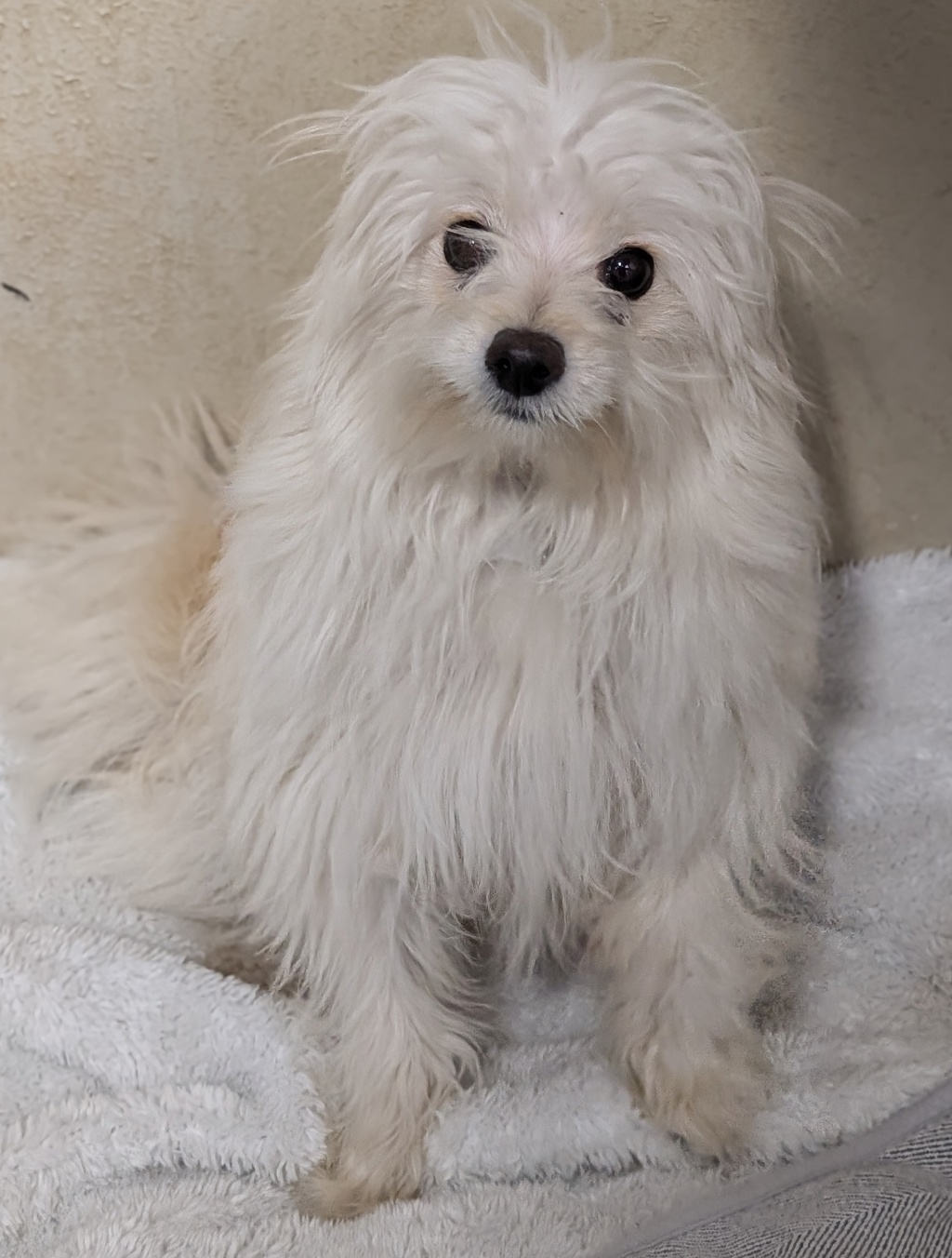Meet Koda, a delightful 9-month-old Maltese x Pomeranian mix. This happy little guy may be a bit timid at first, but once he feels comfortable, his playful and affectionate nature shines through. Koda's adaptability makes it hard to believe he was ever shy!