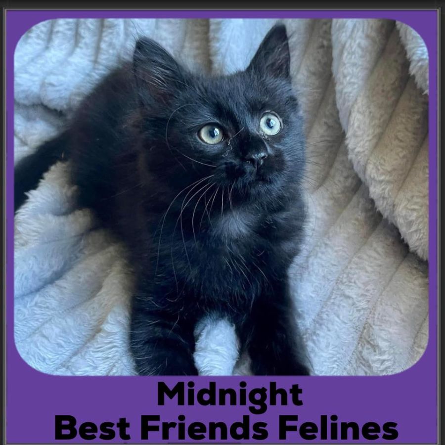 Midnight is a stunning, all-black male kitten with a luxuriously fluffy medium-length coat. This bottle-raised baby loves people and is the epitome of feline charm and affection. Midnight's courage and adaptability shine through as he fearlessly explores new territories, making him an ideal companion for various home environments.