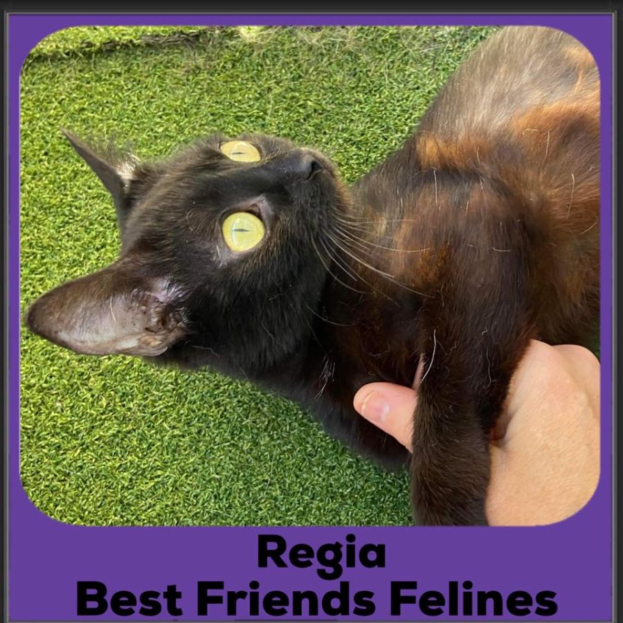 Do you often just stare into the void? Well what if that void not only stared back at you but enjoyed lap cuddles, chin scritches and smooching around your ankles? Definitely an upgrade on the standard void! Meet Regia. Regia came into care from a regional Qld pound with her siblings, all in terrible condition and terrified. She was skinny, partially shaved after being treated for fleas and she had brown ‘fever coat’, a condition where black cats fur is brown due to malnutrition in Mum at birth. Since arriving with her carer she has blossomed into the most beautiful, sleek, jet black, sweetest little house panther there ever was. Although Regia is quiet aside from her cute little trills, she has always been the most confident of her siblings and even on her first day in care she climbed onto her carer’s lap for cuddles. Despite all that this little lady has been through, she still sought out love from her human and now routinely takes over the lap every morning while her carer has coffee.