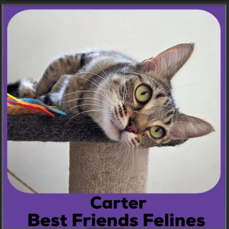 Carter also adores other cats and gets along with every feline he meets. He’d love a friendly cat buddy to play with, or he’d be equally happy as your devoted solo companion.